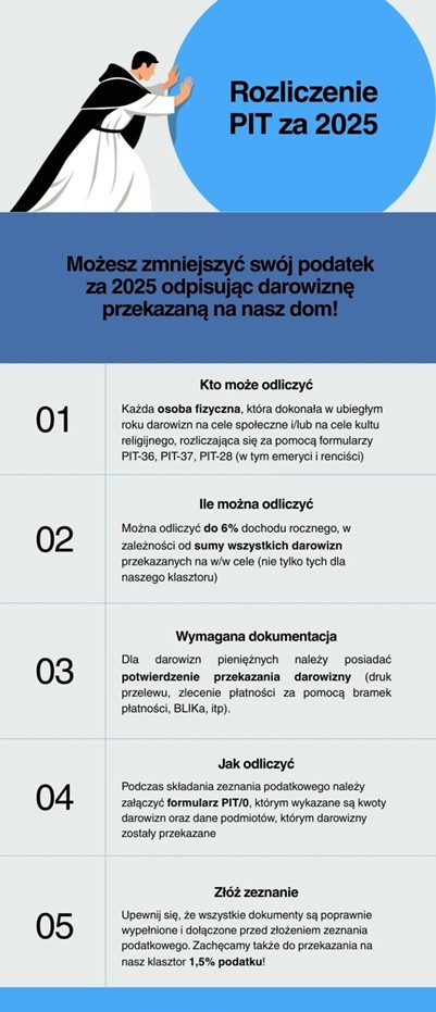 W 2025 roku podjęłyśmy współpracę z FUNDACJĄ ŚW. JACKA, dzięki czemu mają Państwo możliwość przekazania na rzecz naszego klasztoru 1,5 % z odprowadzanego przez Was podatku.